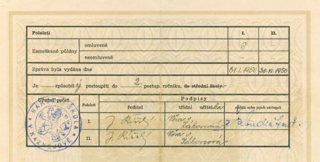Absolventi 1. řídy školního roku 1949/1950 s třídní učitelkou Věrou Žákovcovou. Školní zpráva Pěti třídní národní školy s ředitelem Janem Říšským.