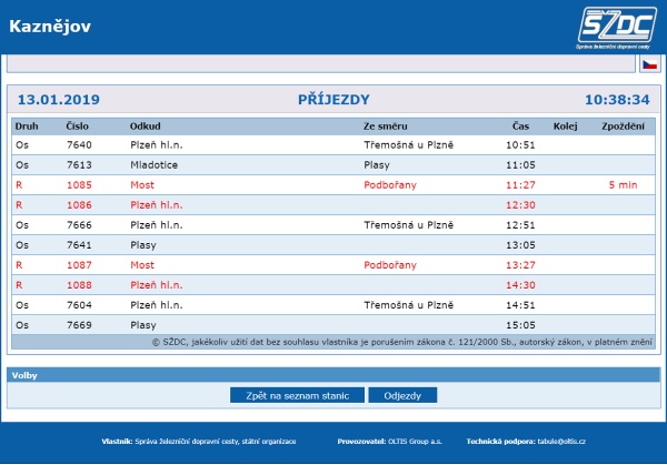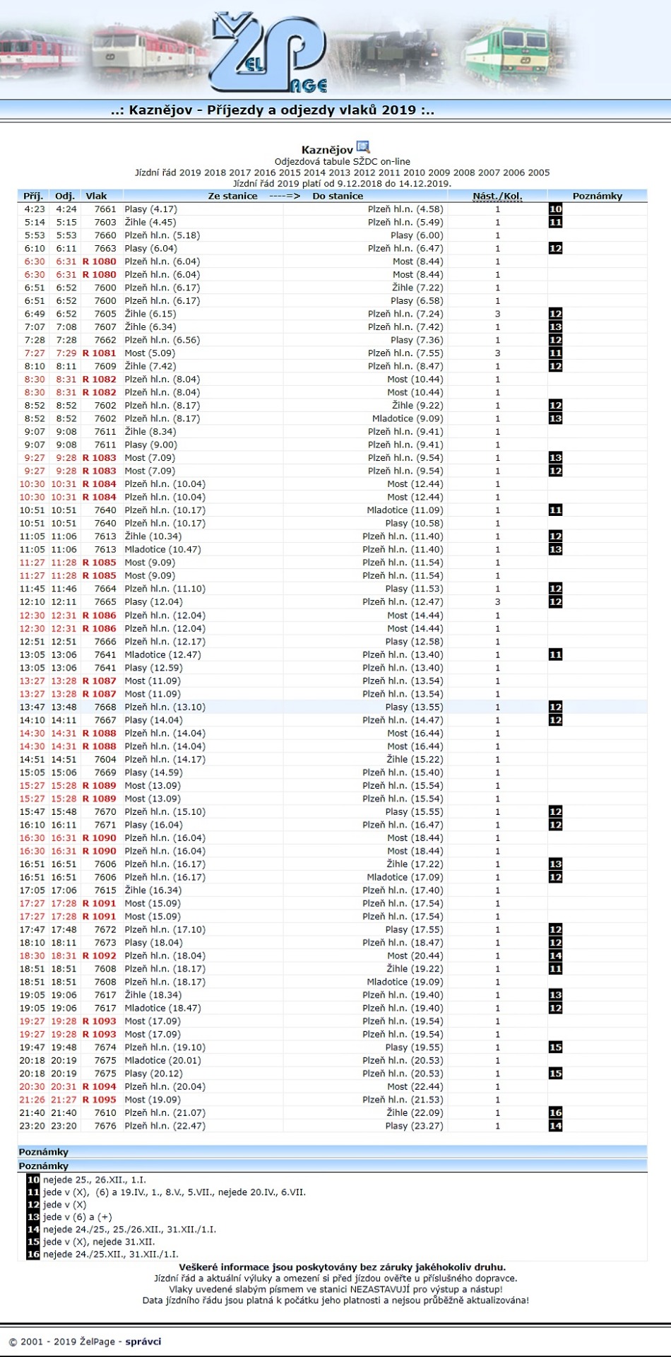 • spojení (spojení z Kaznějova do cílových zastávek) • jízdní řády (zobrazí se po klepnutí) - na příslušné stránce si je možné stáhnout ve formátu pdf